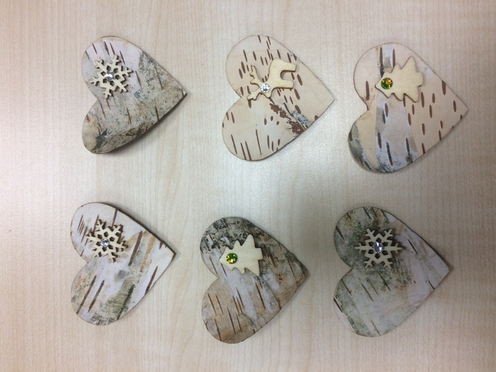 Jmenovky na dárky vyrobené z břízové kůry, zdobeny dřevěným výsekem a swarovski kamínkem