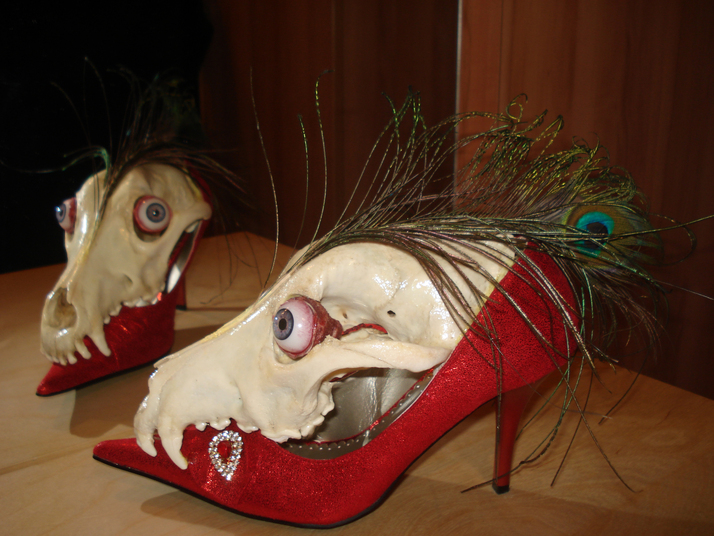 lebka, bota, paví pero, umělé oči