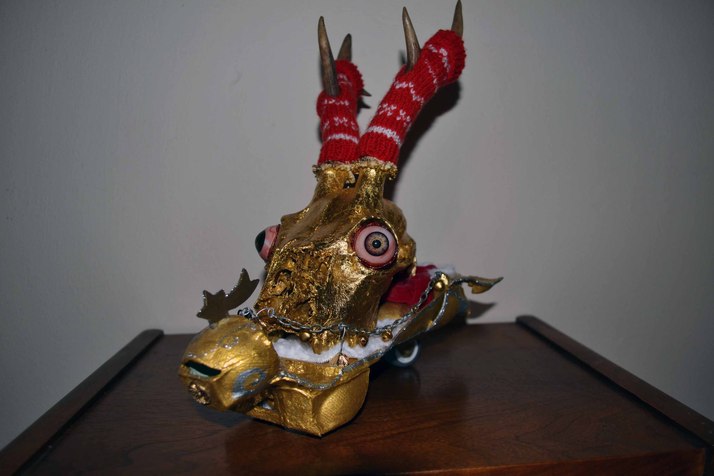 lebka, umělé oči, pletené návleky, papírové vozítko