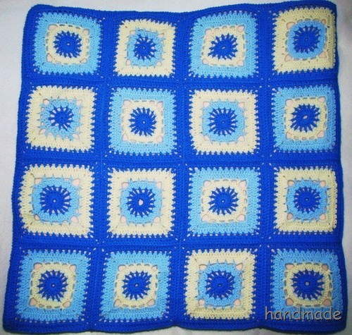 Měkká deka složená z háčkovaných čtverců v barevné kombinaci světle modrá, středně modrá, smetanová. Z rubové strany je ručně podšita dvěma vrstvami smetanového fleecu. Patchwork deka má rozměry 120 cm x 120 cm.