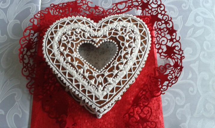 Srdce z perniku 25cm.Baleno v celofanu na tvrde podlozce na objednavku upecu za 450,-na objednavku min.14dni dopredu.posilam i postou za priplatek +150,-posta
