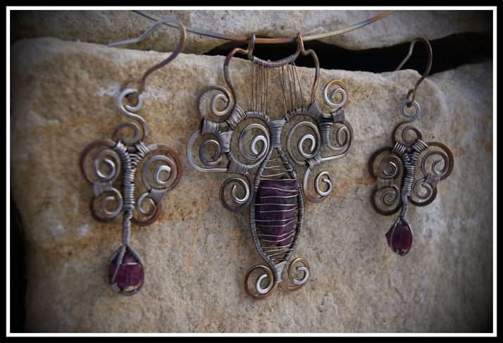 Náušnice a náhrdelník z nerezového drátu (316L) s kamenem surový Rubín - tvořené metodou wire wrapping a tepání, patinované plamenem. Rubín - je vynikající kámen pro vše, co souvisí s energií. Vnáší do života rázný přístup. Dodává energii a rovnováhu, jejíž příliv může mít na citlivější osoby až příliš silný účinek. Rubín podněcuje vášnivou touhu žít, která ale nikdy nenabírá sebezničující podobu. Zlepšuje motivaci a dokáže nasměrovat k realistickým cílům.