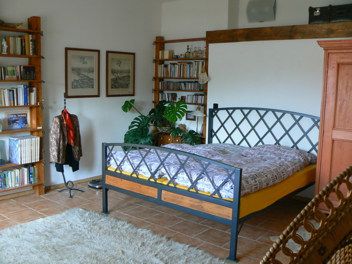 postel kovaná, vykládaná dřevem