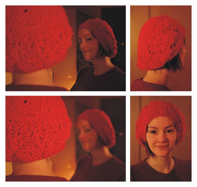 Červený háčkovaný baret. Vzorem jsou reliéfní čtverce.