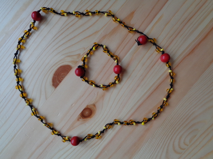 Jednoduchý náhrdelník a náramek z dřevěných červených a skleněných žlutých korálků na černé dvojšňůrce, lze je spojit v jeden náhrdelník.