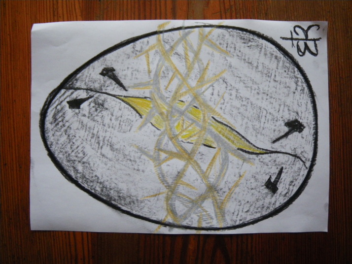 Kovářsky opláštěný korpus černou ocelí, ze štěrbiny svítí naleštěná mosaz. okolo vejce trnvá koruna v barvě bronzu.Zaujmout by měly čtyři obravské kované hřeby "přidržující" opláštění. Symbolika: zrno musí zemřít, má li se probudit Nový život.
