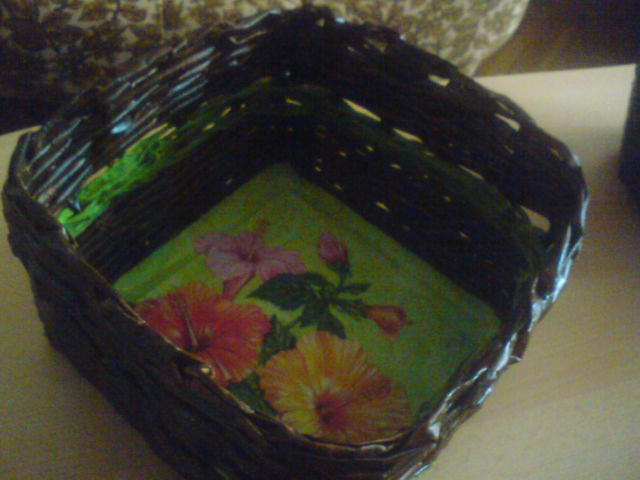 Košíčky jsou pletené z novinového papíru a nalakované hnědou lazurou,která papír maximálně zpevní.Jsou velmi pěkné jako dekorace do interiéru.Není vhodné je nechávat na volném prostranství na zahraděkvůli dešti.