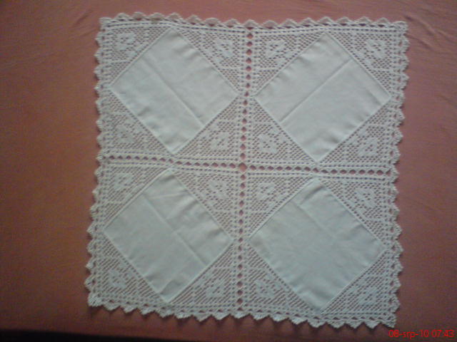 ubrus složený z obháčkovaných čtverců bavlněné látky