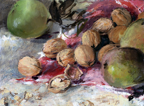 Reprodukce originálního obrazu aranžovaného zátiší z ořechů od akademické malířky Emy Blažkové z roku 1962
