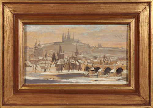 Typické pražské panorama, ozvláštněné přítomností sněhové pokrývky od akademické malířky Emy Blažkové z roku 1964
