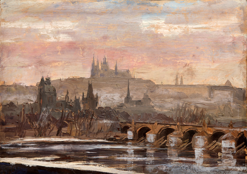 Klasický pohled na základní panorama Prahy od akademické malířky Emy Blažkové z roku 1932