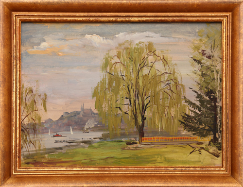 Nádherné zákoutí Prahy, plné klidu a pohody, zachytila akademická malířka Ema Blažková na svém obraze přírody Císařské louky, v pozadí s Vyšehradem.