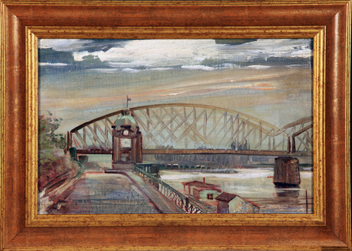 Jednoduše a při tom dokonale zachycené zákoutí Prahy, které zachycuje nejen konec náplavky a její vyústění u železničního mostu, ale i celý železniční most. Obraz je pro dnešního diváka o to cennější, protože vznikal v době, kdy nikde nestála zaparkovaná auta a existuje tak možnost alespoň na obraze si připomenout ty idylické doby bez aut.