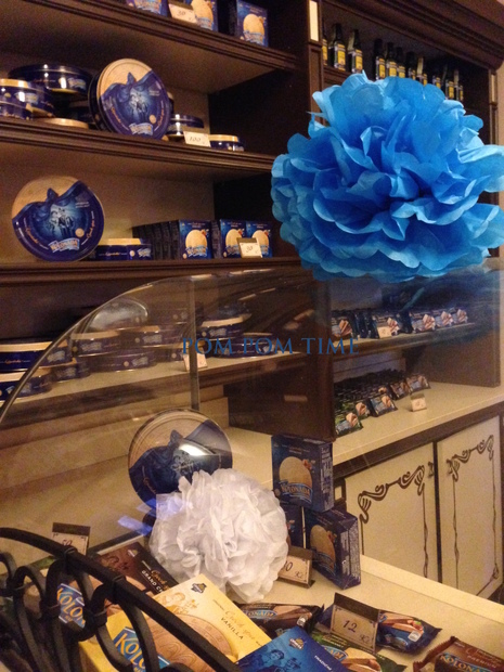 Dekorace kavárny modrým a bílým pompomkem