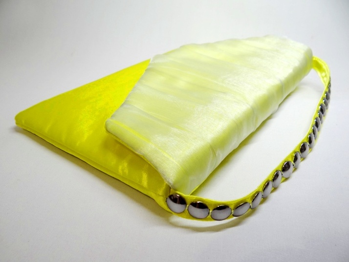 Psaníčko ze žlutého saténu v kombinaci s šedým tylem. Ušité na přání k šatům ve stejných látkách.