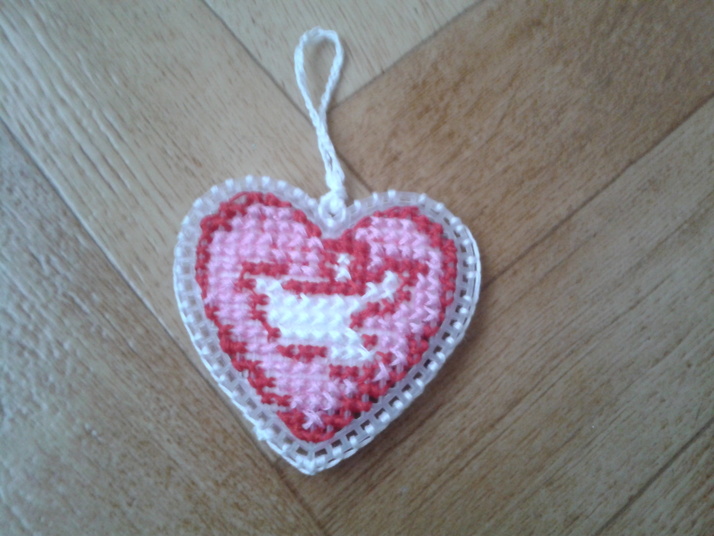 Srdíčko vyšité z obou stran na zavěšení, cena 39,- Kč. Délka 7 cm, šířka 8 cm.
