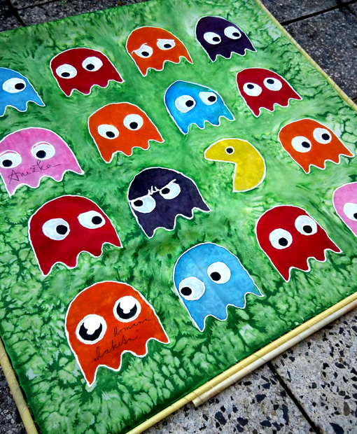 Malovaný hedvábný šátek s geek motivem Pac-mana.