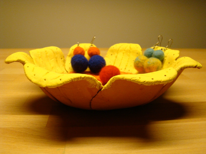 Miska ve tvaru rozkvetlé květinky,o průměru 16x17cm,na Vaše náušničky,prstýnky,náramky,sponečky,či jiné drobné radosti,je vyrobena ze samotvrdnoucí hmoty,nabarvena žluto oranžovou temperovou barvou.