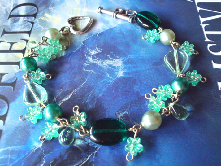 Náramek je tvořen z různě velkých skleněných korálků tyrkysové a zelené barvy a plastových lesklých kytiček. Americké zapínání v barvě starostříbra.