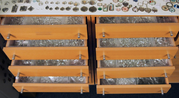 Část skleněných kabošonů ve vzorkovně. Teď máme teměř 40 druhů.