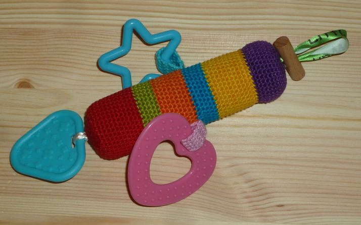 Uvnitř těla hračky atestované pískadlo, stuha s knoflíkem a zaháčkovaná kousátka se strukturovaným povrchem pro snažší prořezávání zoubků.