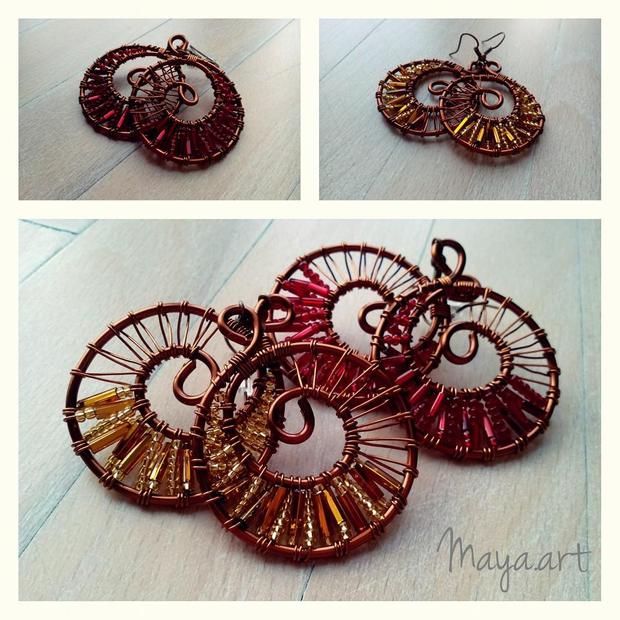 Drátované náušnice z kolekce "WIRE CIRCLES" jsou vyrobeny z měděného drátu vyplétaného rokajlem a skleněnými trubičkami.