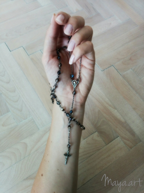 Růženec je vyroben z modrošedých broušených korálků a staroměděných řetízků a komponentů technikou ketlovaní.