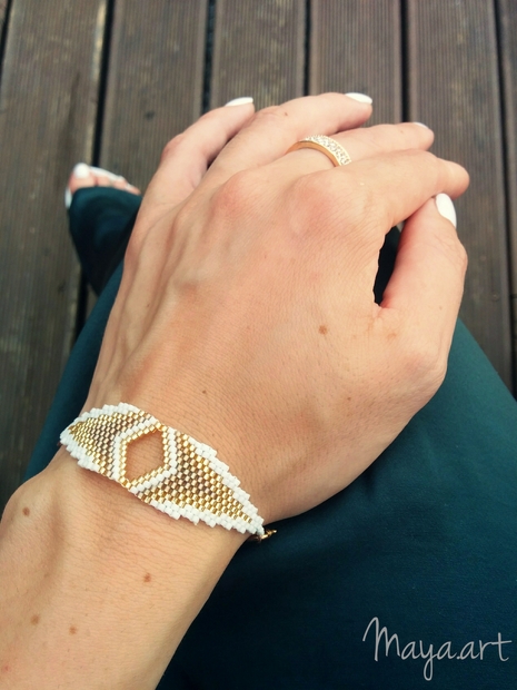 Šitý náramek je vyroben technikou tkaní korálků "peyote stitch" z rokajlu TOHO.