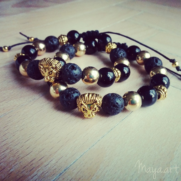 Náramek je vyroben z lávových korálků doplněných o kovové mezidíly.