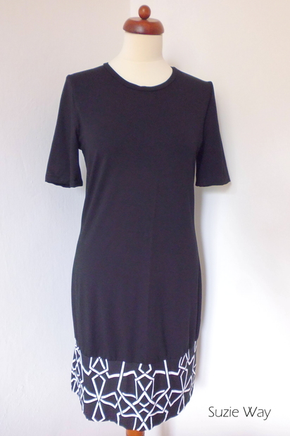 Černé šaty s efektní bordurou jsou ušity se středně dlouhým rukávkem. Zvolený materiál je jemný úplet - ideální teď na letní lenošení :)
