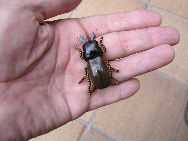 Několikanásobně zvětšený skutečný brouk (Ceruchus chrysomelinus Hochenwarth, 1785), původně vyrobený do kazety s dřevokaznými chrobáky...