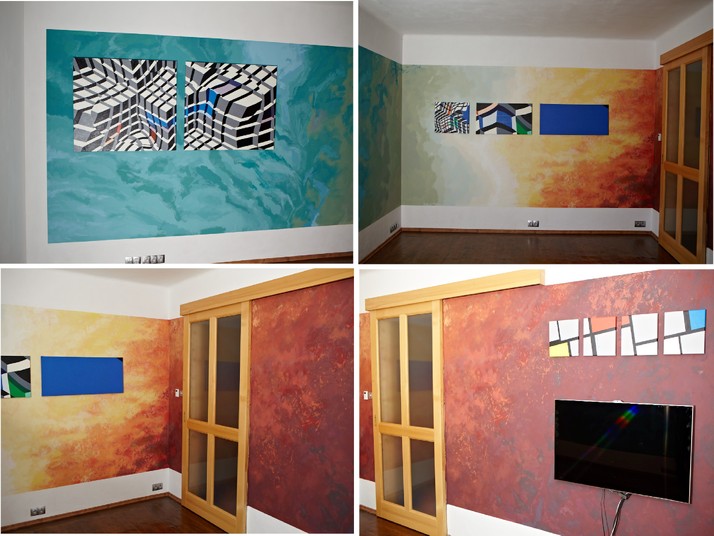 Abstraktní malba posloužila jako podklad pro instalaci geometrických pláten.