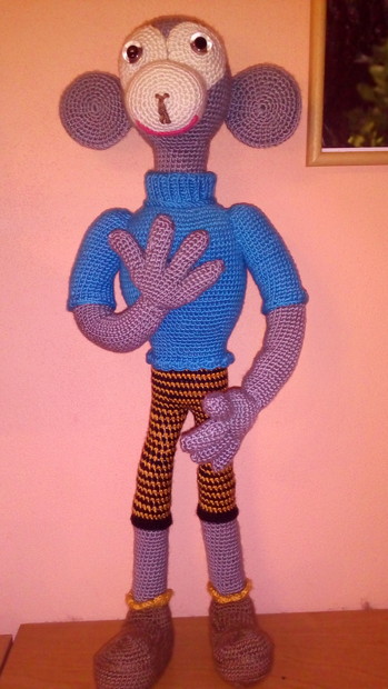 ručně háčkovaný opičák - kulturista, materiál akryl, výplň duté vlákno, výška s cca 46 cm, bezpečnostní oči.