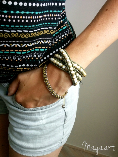 Wrap náramek je vyroben ze zelené kožené šňůry a zelenobílých korálků. Řetízkový náramek je vyroben ze starostříbrného řetízku a zelené bavlněné šňůry.