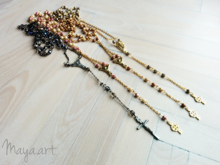 Růžence jsou vyrobeny z kovových komponentů a broušených korálků technickou ketlovaní. Jsou doplněny o madonu a křížek.