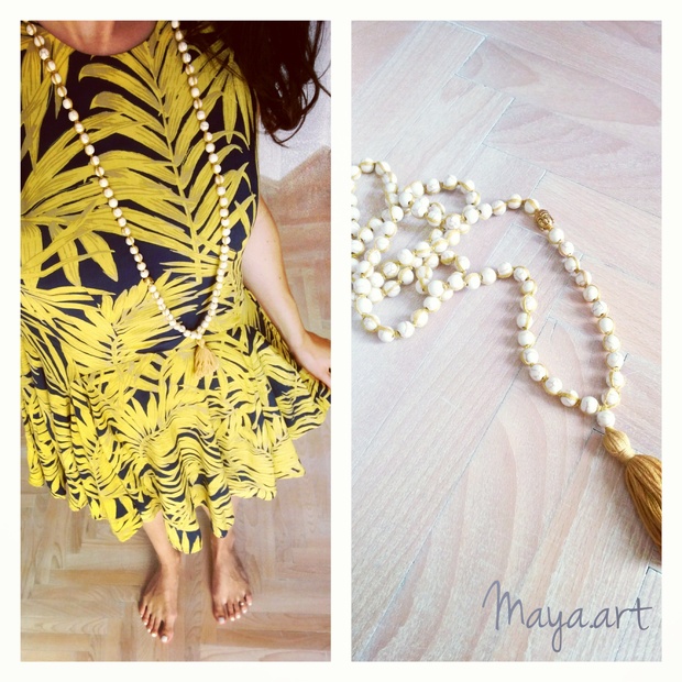 Náhrdelník je vyroben z žíhaných béžovobílých korálků drhaných na béžověžluté bavlnce. Zdobným prvkem je střapec zhotovený z bavlny. Náhrdelník je doplněn pozlaceným Buddhou.