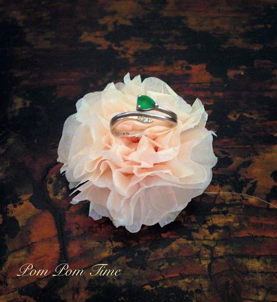 Mini Pompomky v barvě Champagne pro nevěstu posloužlly jako svatební stojánek na prstýnky