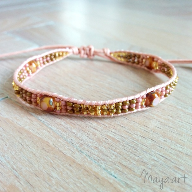 Náramek je vyroben z rokajlu a broušených korálků tkaných na bavlněnou šňůru.