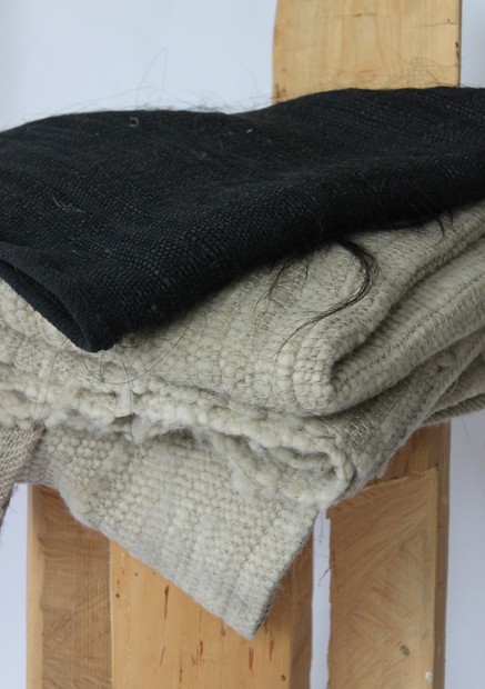 Doma máme koníka- a tadz vidíte látku utkanou z její hřívy. Pod tím je látka utkaná z ovčího rouna, nepočesaného.