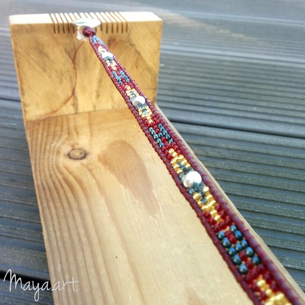 V procesu tvorby tkaní náramku z rokajlu a broušených korálků na kůži.