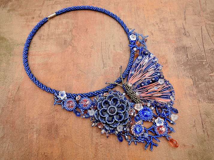 Náhrdelník pro projekt "Společnýma rukama" - keramická květina od Efraim, Shibori ribbon, Swarovski components, Toho round, Preciosa, broušené korálky, mačkané korálky