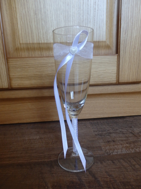 Skleničky na přípitek pro novomanžele zdobené saténovou a šifónovou stuhou s malým srdíčkem.