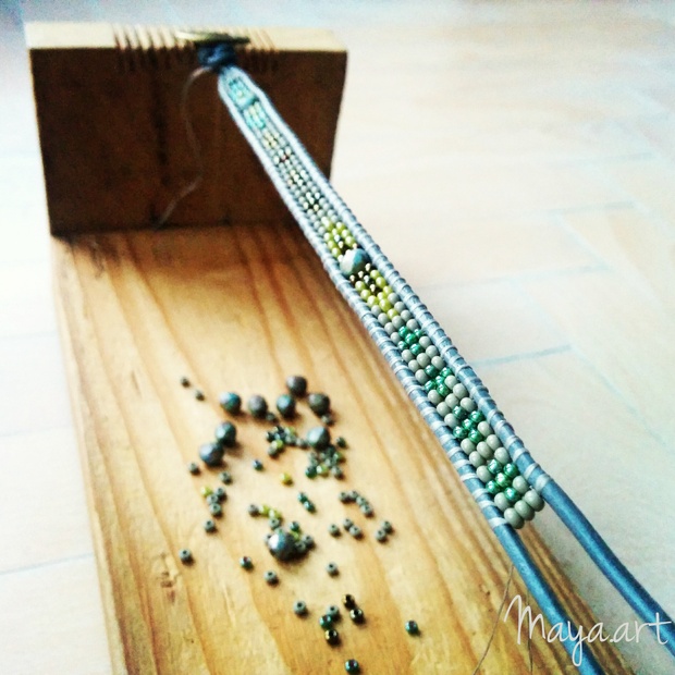 V procesu tvorby tkaného náramku rokajlem a broušenými korálky na šedou kůži.