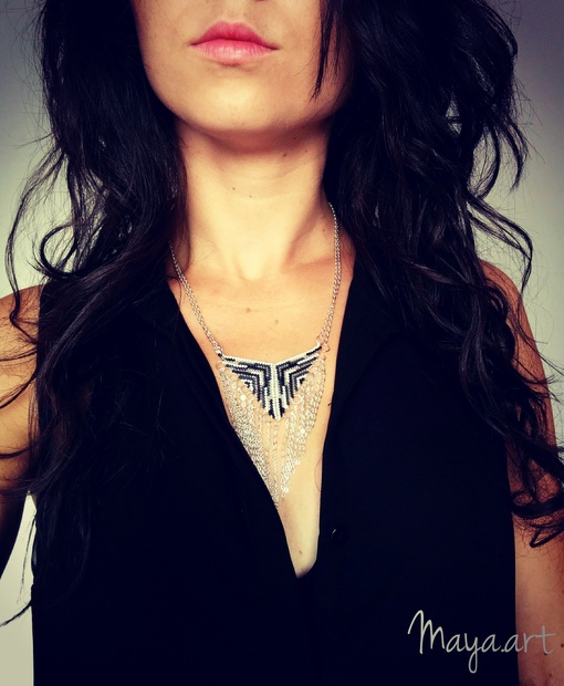 Šitý náhrdelník je vyroben z kvalitního japonského rokajlu TOHO technikou šití korálků "peyote stitch". Náhrdelník je dozdobený postříbřenými řetízky.