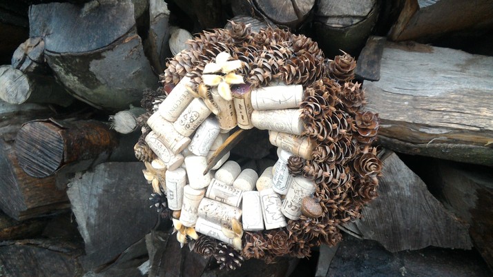 Korpus sláma, lepení korky, šišky. Nástěnné dekorace pro milovníky vína.