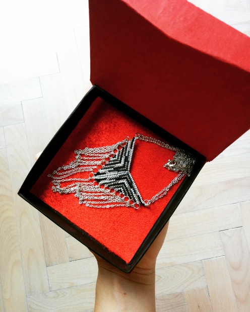 Šitý náhrdelník stehem "peyote stitch" z rokajlu TOHO dozdobený postříbřenými řetízky.