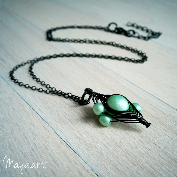 Clarisky jsou drátováné součásti šperku vyrobené z korálků obmotaných drátem. Náhrdelník je vyroben z matné perličky v zelené barvě, černého lakovaného drátu a černého bižuterního řetízku.