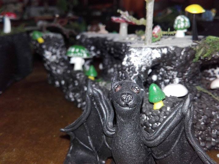 Les vyřezán s Polystyrenu-natřen akrylovými barvami,ošetřen,barvený mech,Houby-Sruby a chatky-ruční výroba z polymerové hmoty-ošetřeno lakem na polym.hmot.