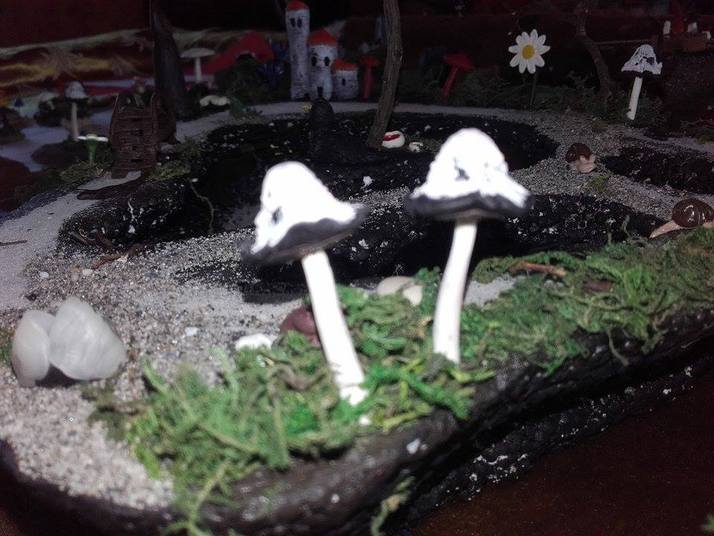Les vyřezán s Polystyrenu-natřen akrylovými barvami,ošetřen,barvený mech,Houby-Sruby a chatky-ruční výroba z polymerové hmoty-ošetřeno lakem na polym.hmot.