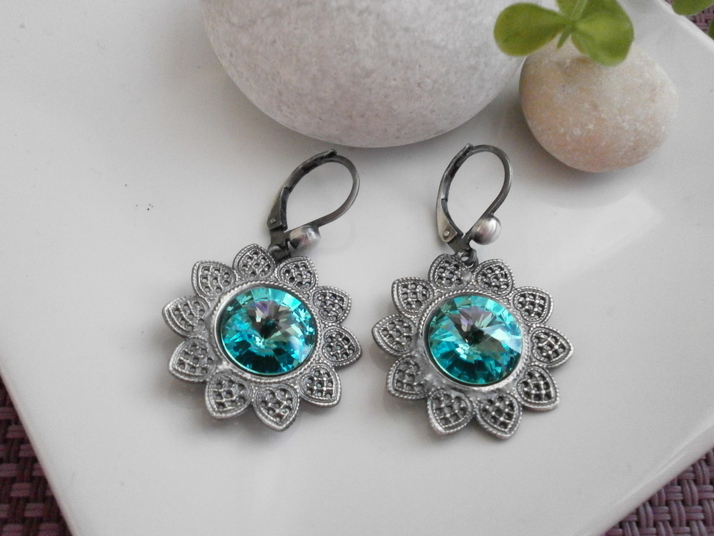 náušnice z francouzského starostříbra Slunečnice klapky v kombinaci se Swarovski- barva Light Tyrkys. Možno i v jiných barvách.
